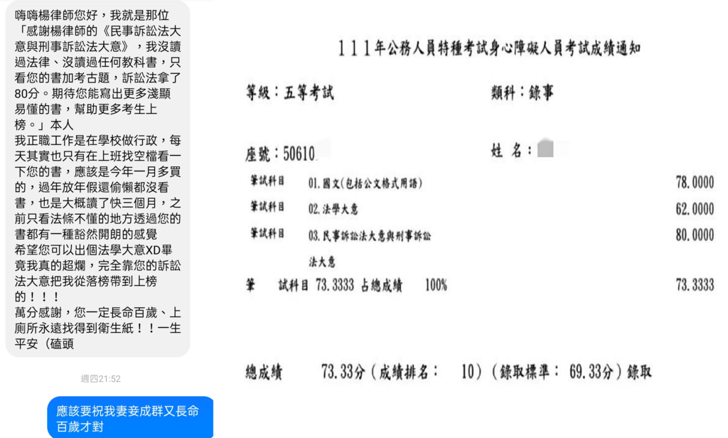 讀者的信:非法律系,白天工作,實質上只看1個月,全國第10名